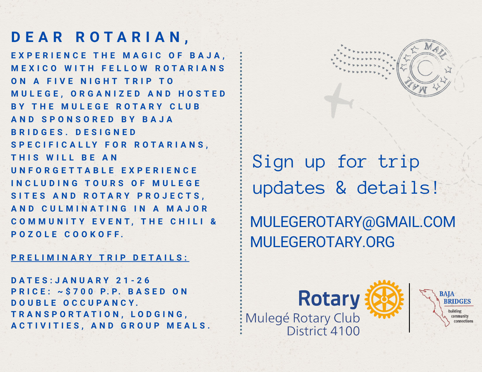 Check back here for additional event details as they become available, or feel free to email us at mulegerotary@gmail.com with specific questions or to be added to our trip communications list.